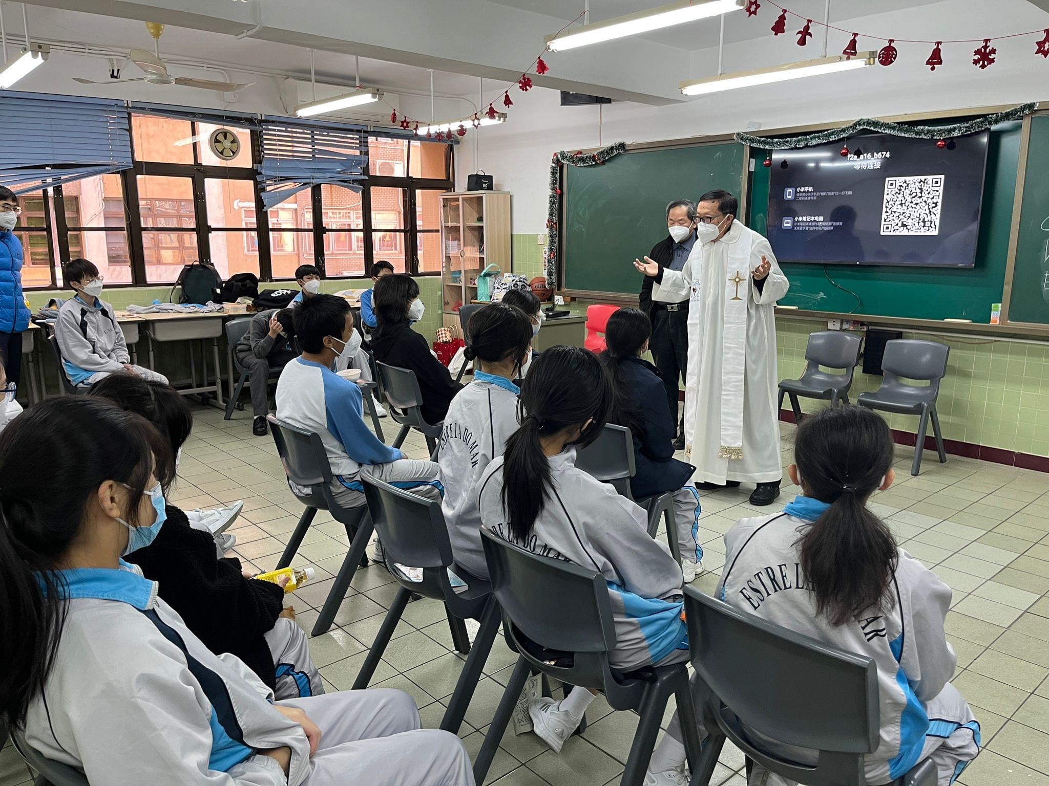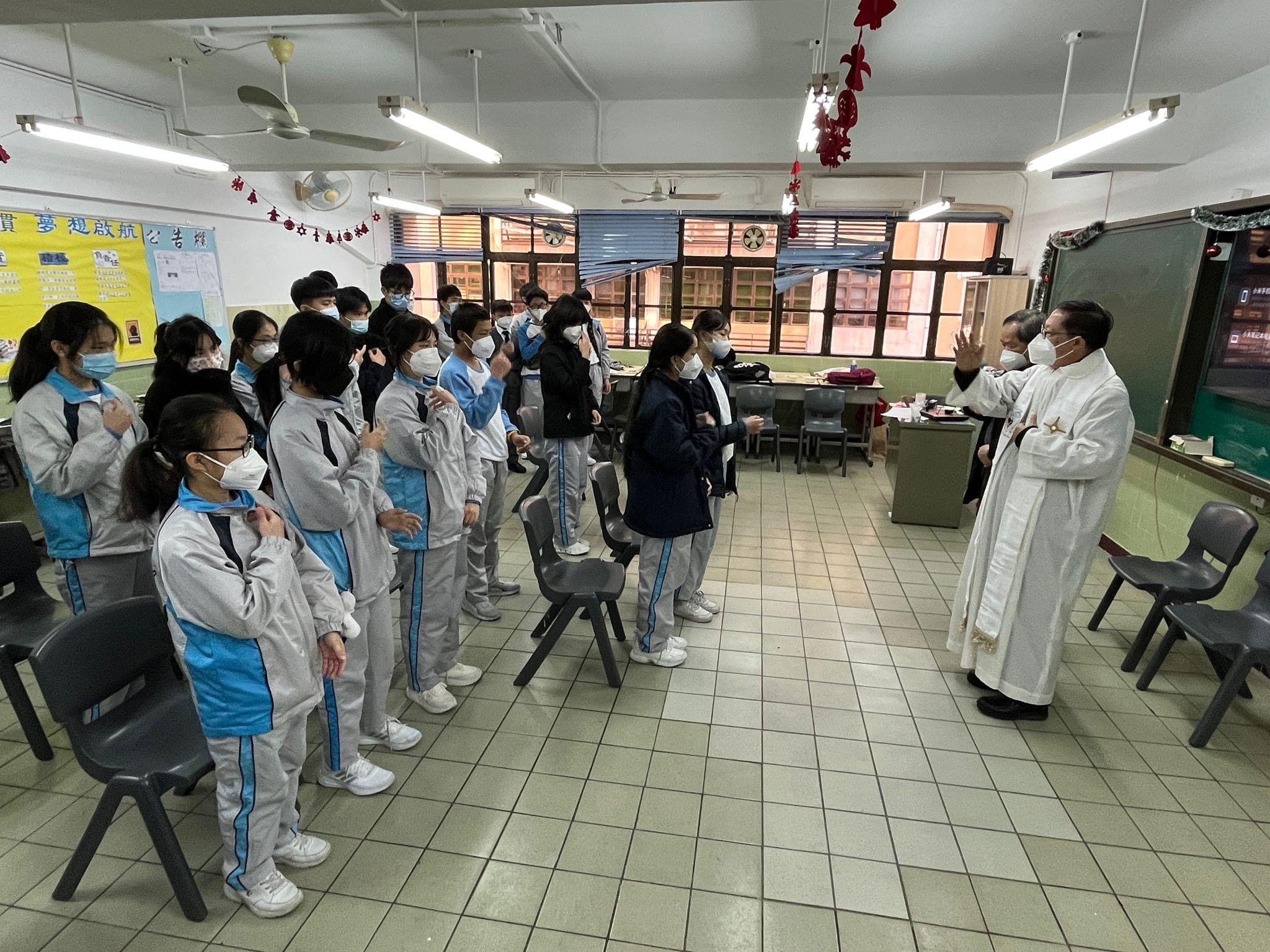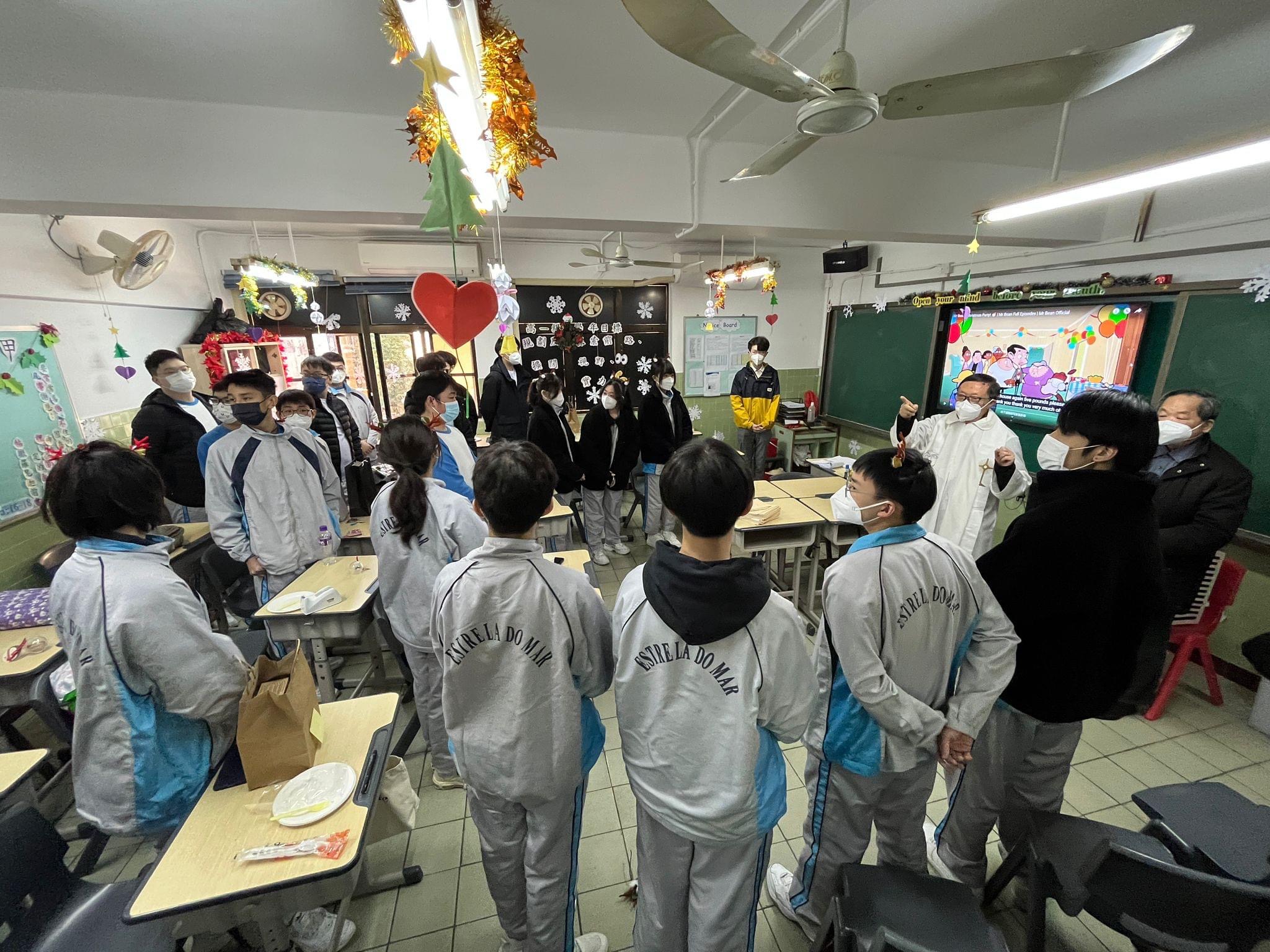 隨後各班同學在用心佈置的班房內進行聯歡聚會,樂也融融,校牧陳俊偉神父在黃彪校長的陪同下,走進每個班房內逐一進行降福禮,將平安和喜樂恩賜給老師和學生們,祈求疫情早日完結,辭舊迎新,讓師生們告別疫情不斷的一年,懷著一顆感恩的心去迎接新一年的到來!
