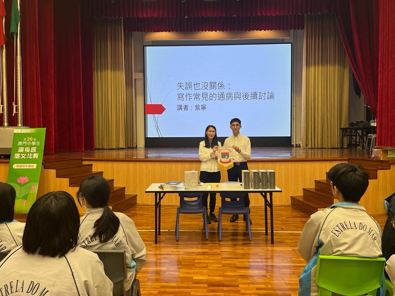 為激發學生閱讀熱情,提升中文寫作水平,本校聯合澳門基金會合辦「澳門中學生讀後感徵文比賽」閱讀寫作講座,是次活動邀請到本澳著名作家紫寧蒞臨作主講嘉賓,主題「失誤也沒關係:寫作常見的通病與後續討論」。