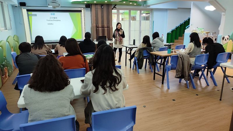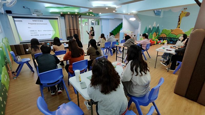 吳女士首先闡述了何謂「預備好的環境」六個要素,包括:教具、自然、群體、美觀、自由及秩序,讓教師在佈置課室及選取教具時,依學習領域及教學難易次序擺放及設計課室空間區域,並按幼兒的學習進度制定學習計劃,使幼兒在這個預備好的環境下培養其獨立性、意志力、自律並進行主動學習。另外,透過教師分享個案,在日常處理學生的管教問題中,導師分析如何利用正向管教方法,例如引導幼兒能以「我」去描述所看到的、覺得的、希望怎樣來幫助他們建立解決問題的能力。最後,導師說明了與家長建立伙伴、合作關係最為重要,教師應與家長建立溝通、互信和尊重,並協助家長認識蒙特梭利教學及正向管教的知識,期望把握幼兒的「黃金期」,發展幼兒所有的感官並減少使用電子產品,設定合理的期望,最終能促進學生的學習成長及全面發展。