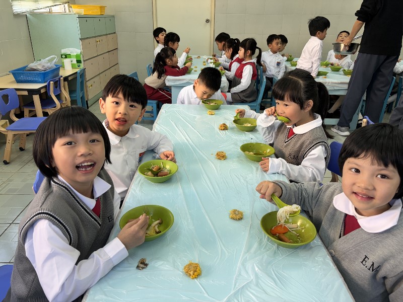本校著重小朋友透過活動中學習,所以配合單元學習目標「珍惜食物」及「保護環境」,安排小朋友進行吃火鍋活動過程中,他們會互相分享自己帶回來及購買的食材,同時與老師在課堂上教導的知識作連結,豐富其學習經驗。