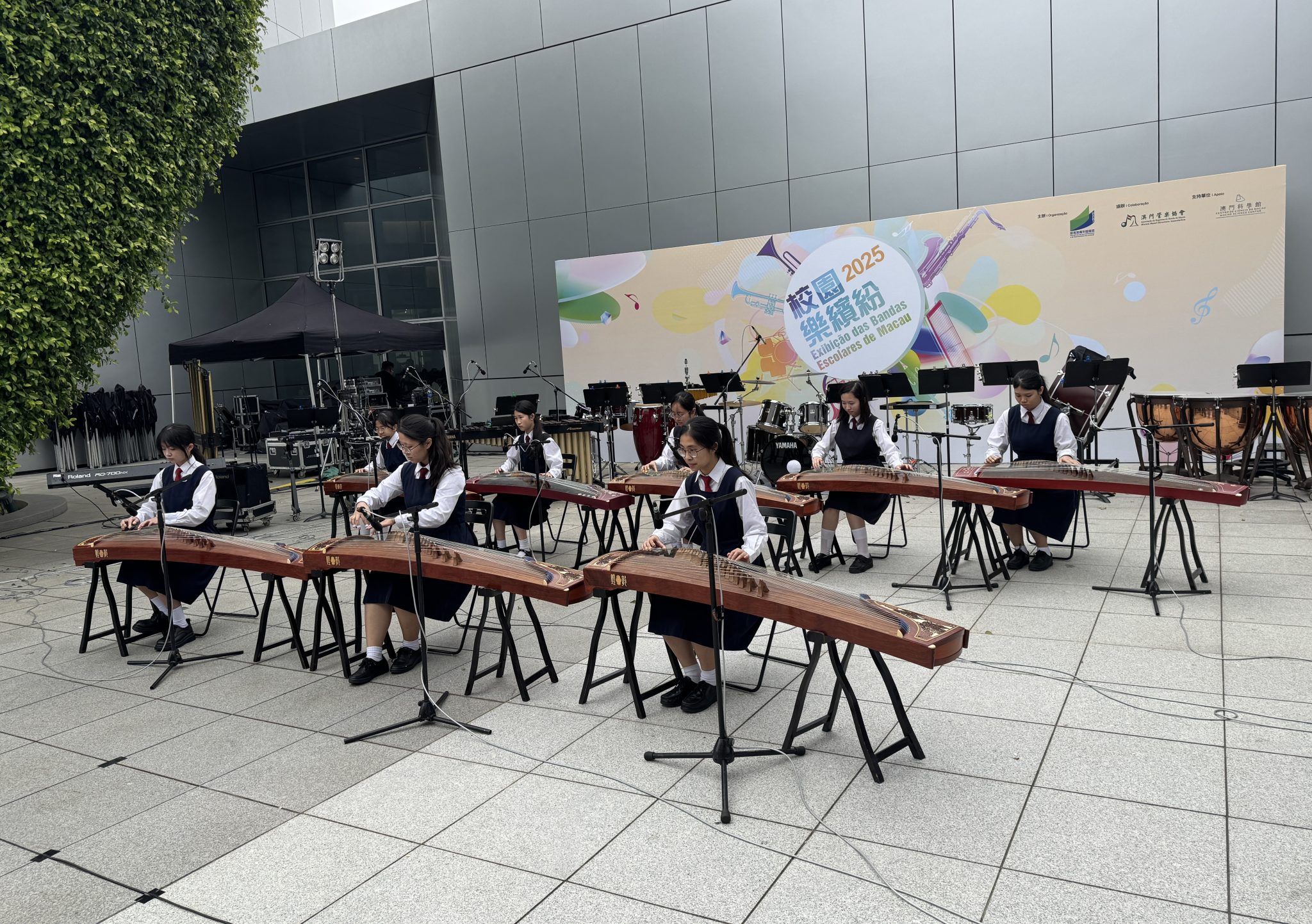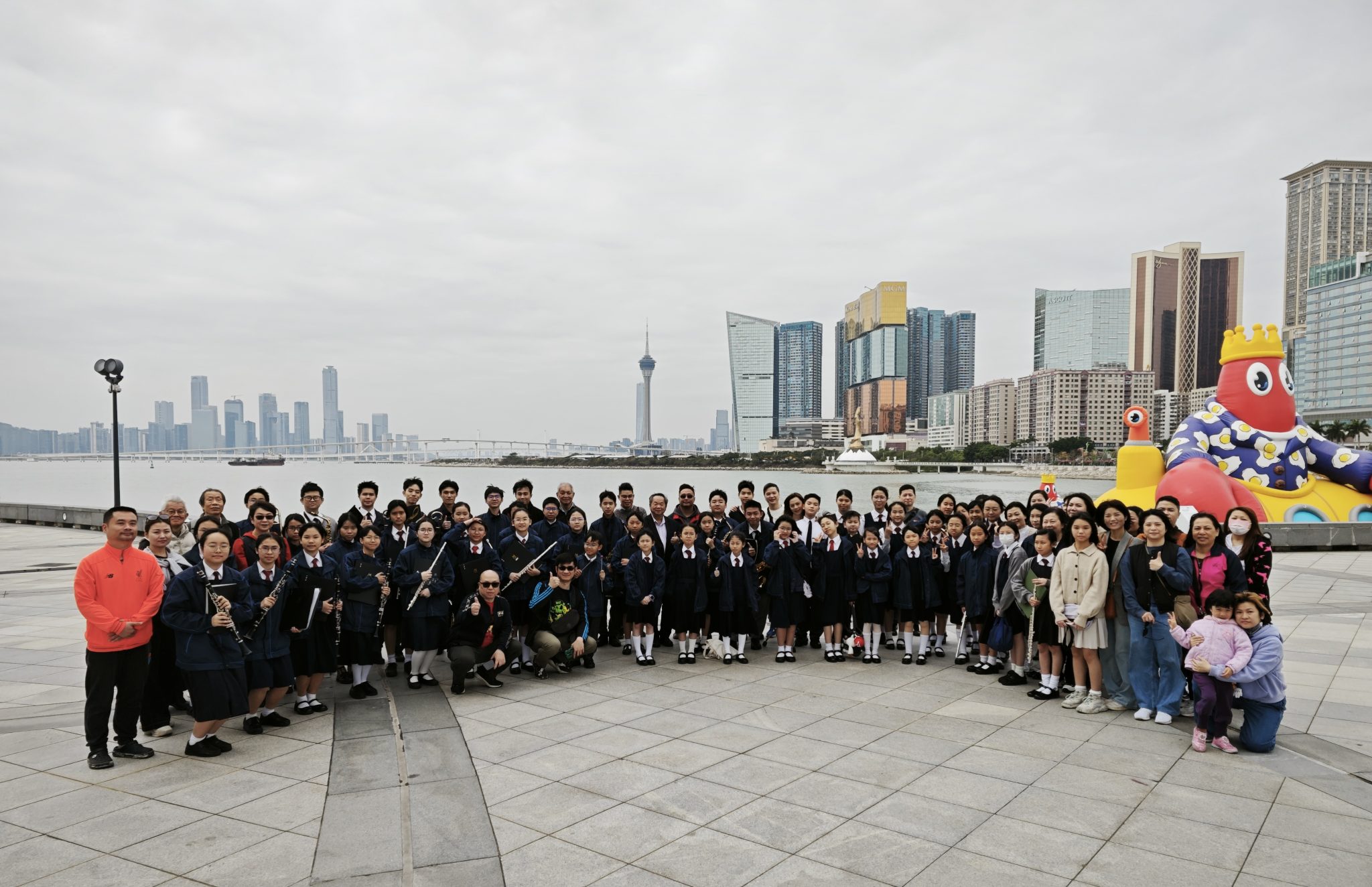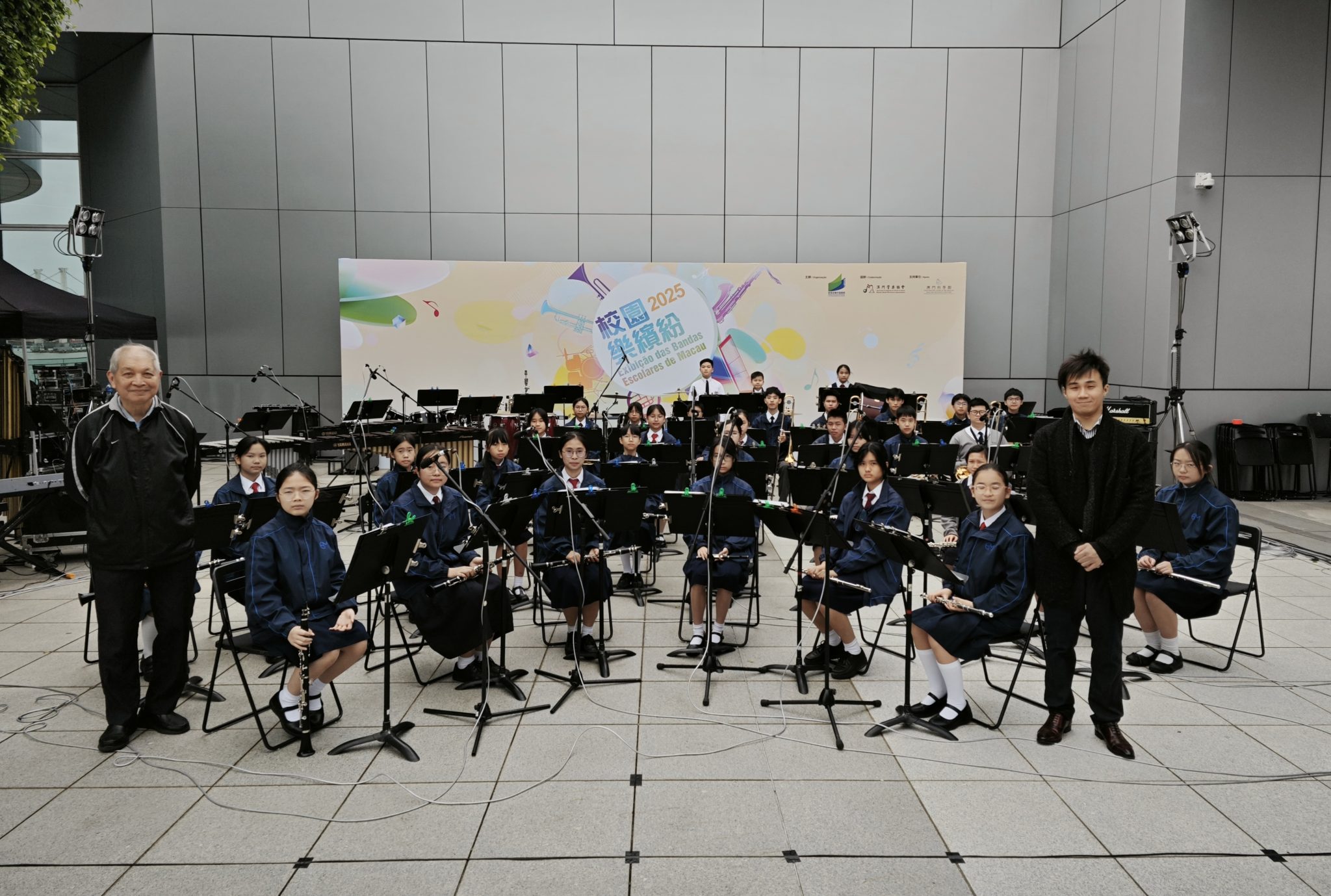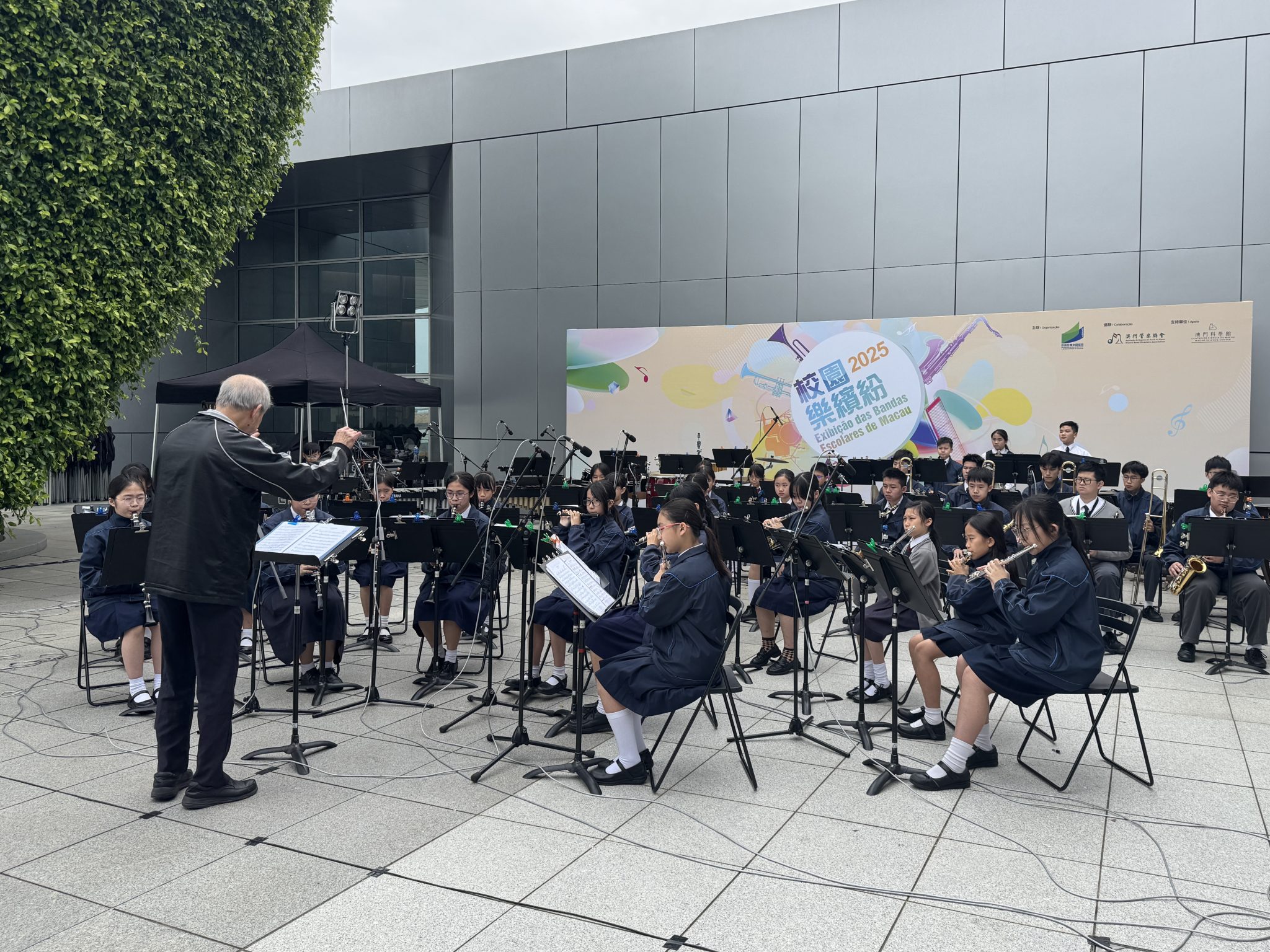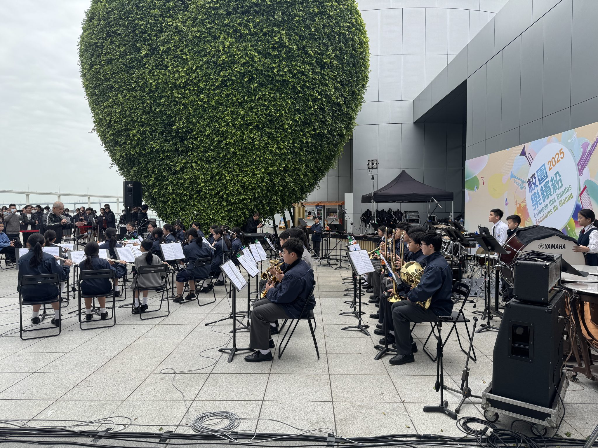 由教育及青年發展局主辦的「校園樂繽紛2025」活動,為全澳學校樂隊提供了良好的學界交流平台。今年,共有來自27所學校的超過1,100名中小學生參加演出。海星中學於3月9日共派出了60位管樂團和古箏團的學生,在澳門科學館心形樹廣場進行了精彩的演出,表演了七首中外名曲,包括《運動員進行曲》、《肯肯舞曲》、《燈光裡的中國》、《愛は勝つ》、《小河淌水》、《市集》及《南泥灣》,贏得了現場觀眾的熱烈掌聲。