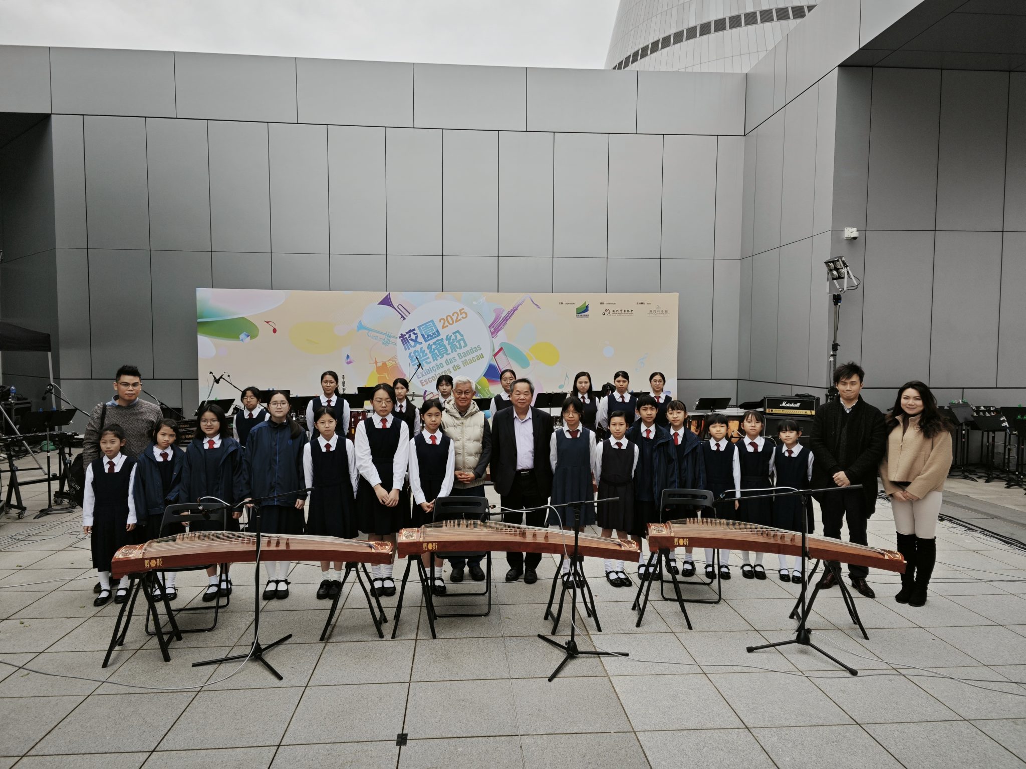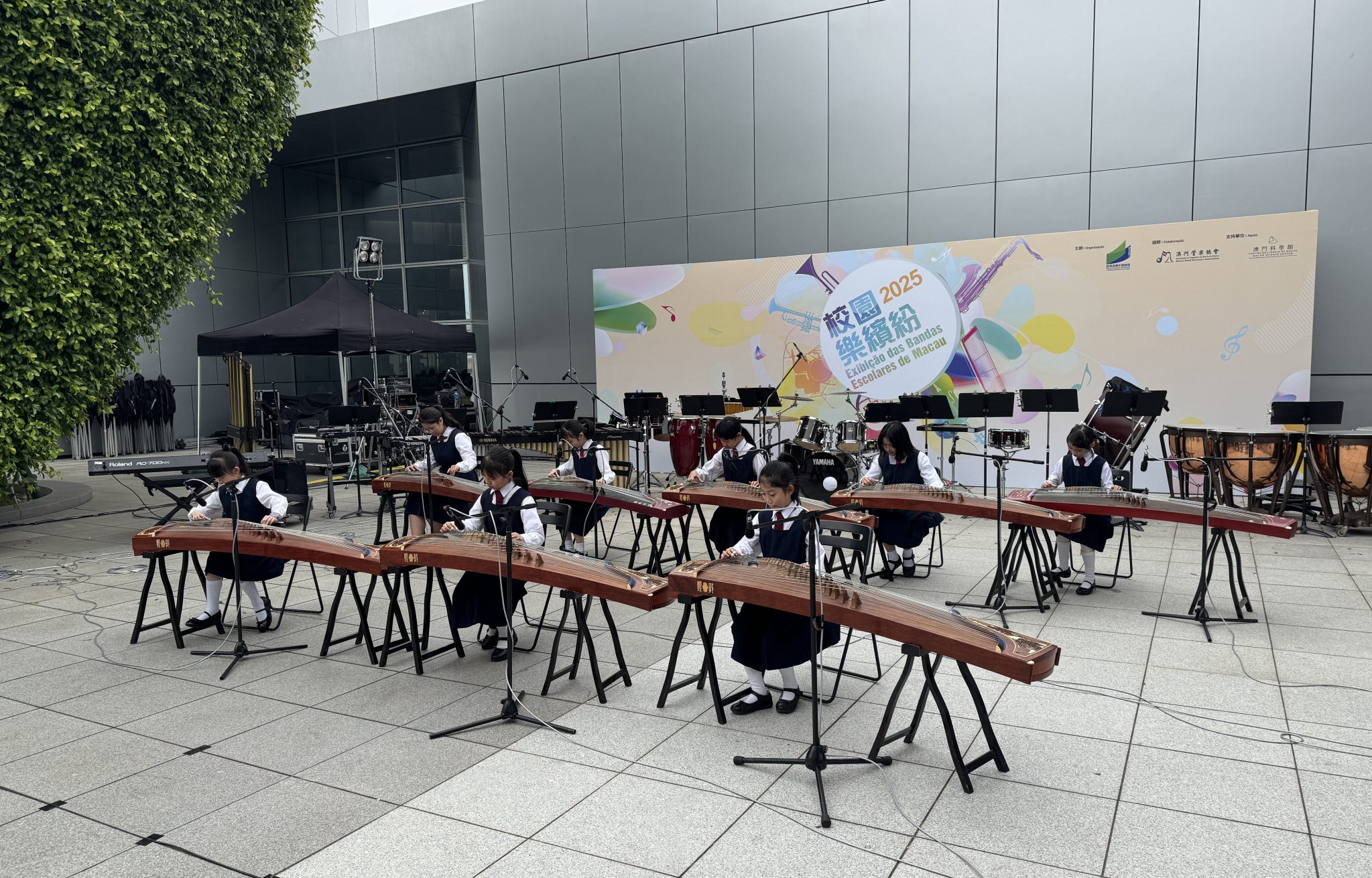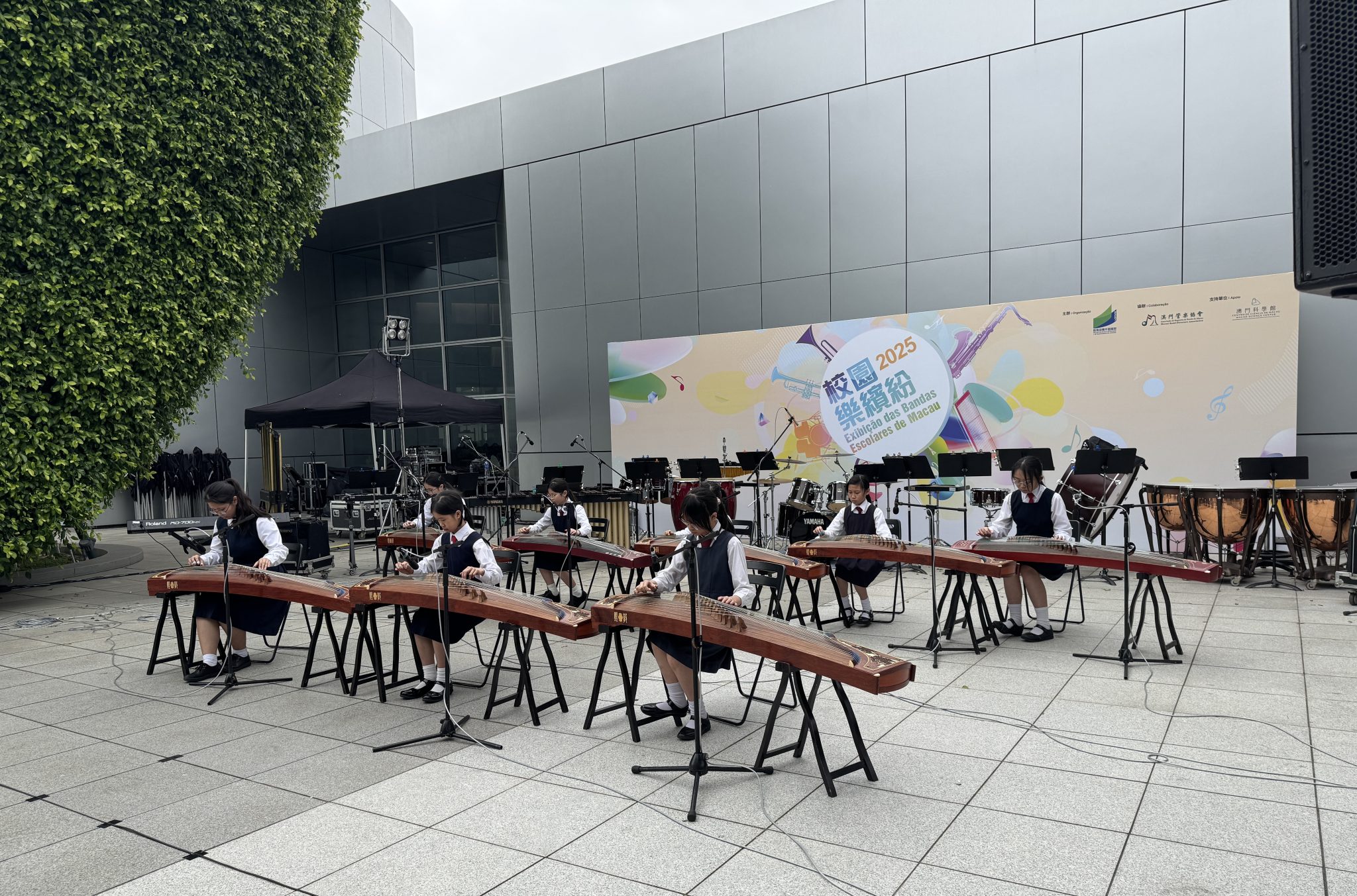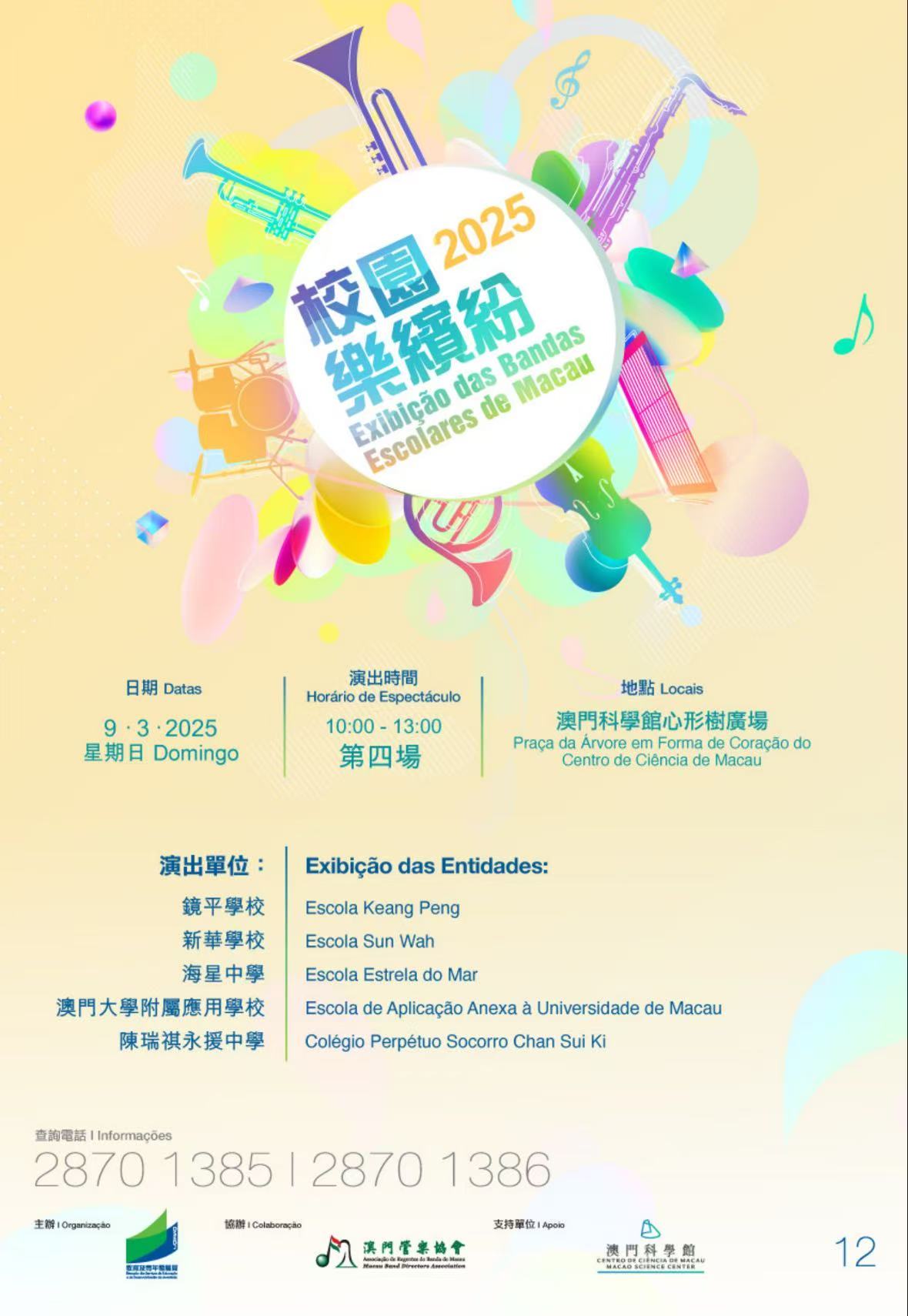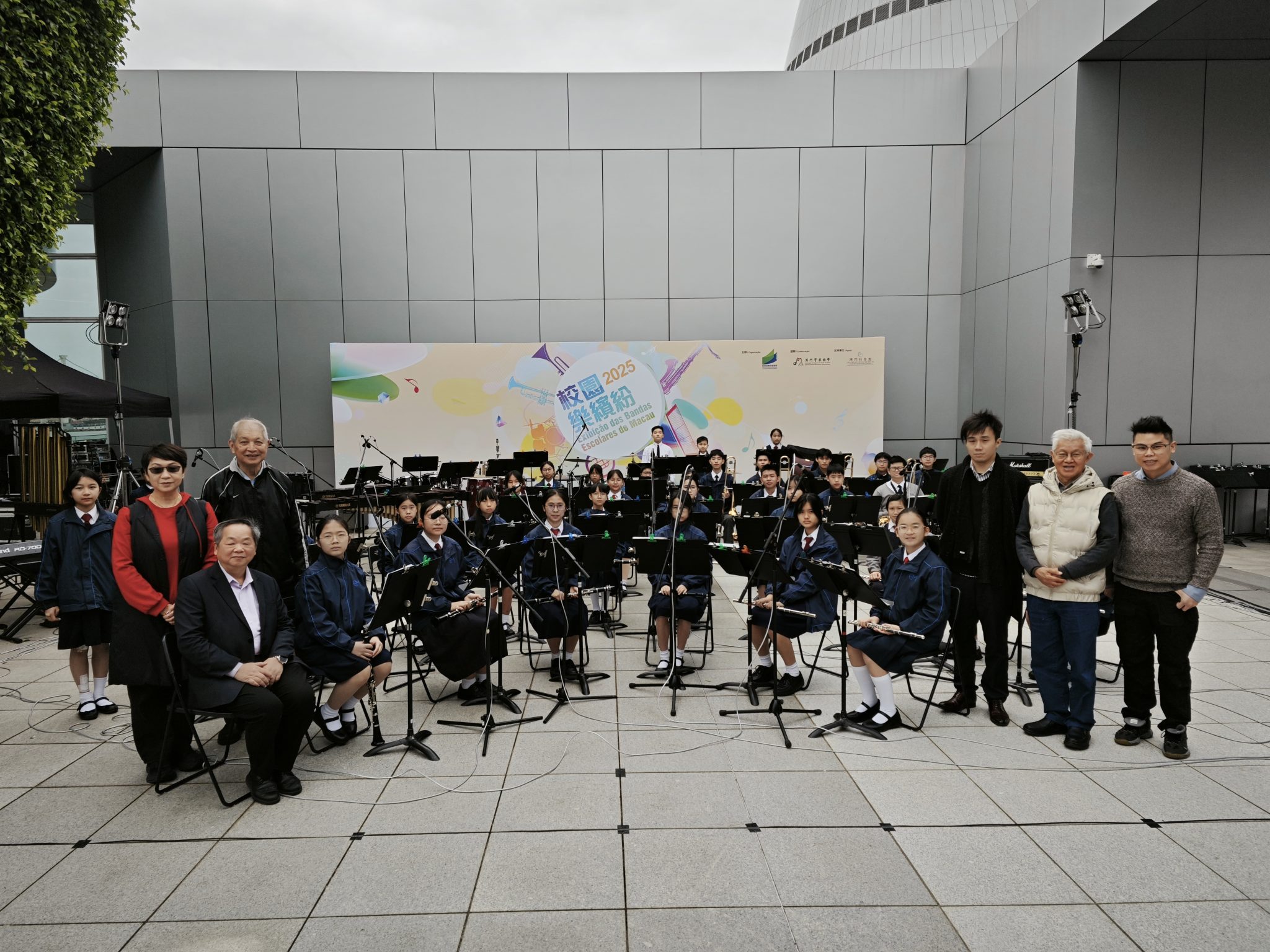 由教育及青年發展局主辦的「校園樂繽紛2025」活動,為全澳學校樂隊提供了良好的學界交流平台。今年,共有來自27所學校的超過1,100名中小學生參加演出。海星中學於3月9日共派出了60位管樂團和古箏團的學生,在澳門科學館心形樹廣場進行了精彩的演出,表演了七首中外名曲,包括《運動員進行曲》、《肯肯舞曲》、《燈光裡的中國》、《愛は勝つ》、《小河淌水》、《市集》及《南泥灣》,贏得了現場觀眾的熱烈掌聲。