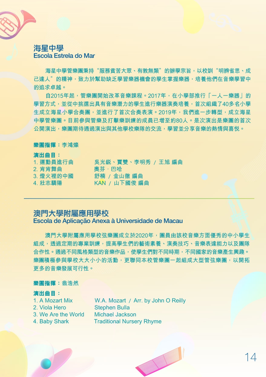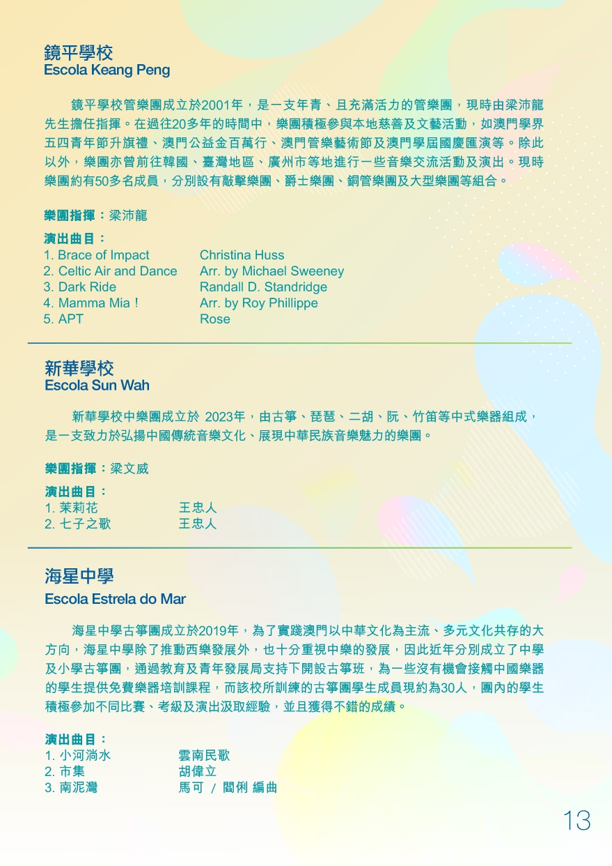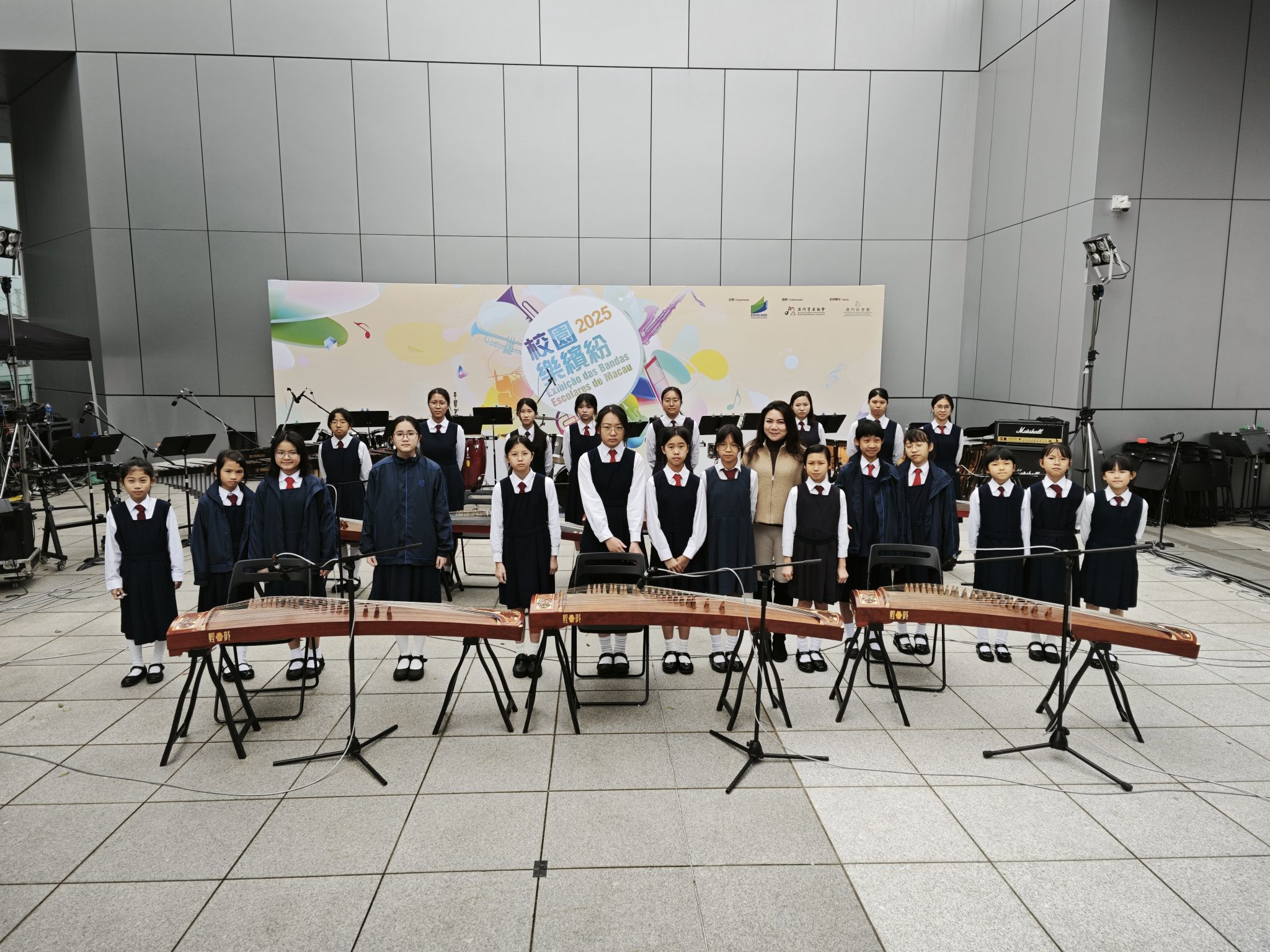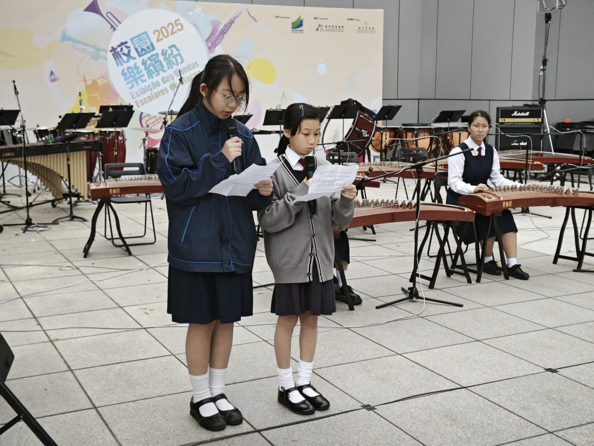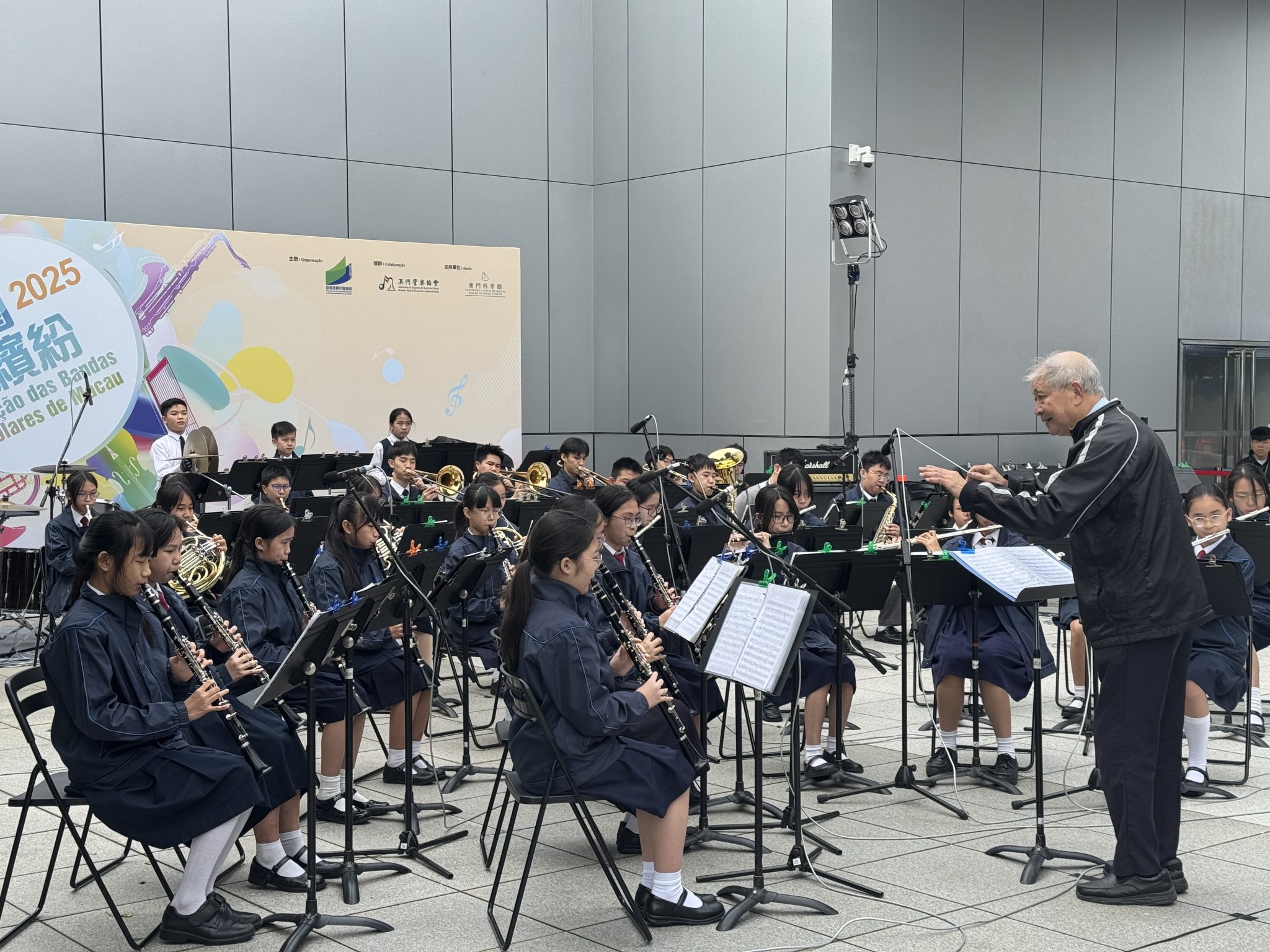由教育及青年發展局主辦的「校園樂繽紛2025」活動,為全澳學校樂隊提供了良好的學界交流平台。今年,共有來自27所學校的超過1,100名中小學生參加演出。海星中學於3月9日共派出了60位管樂團和古箏團的學生,在澳門科學館心形樹廣場進行了精彩的演出,表演了七首中外名曲,包括《運動員進行曲》、《肯肯舞曲》、《燈光裡的中國》、《愛は勝つ》、《小河淌水》、《市集》及《南泥灣》,贏得了現場觀眾的熱烈掌聲。