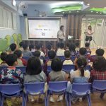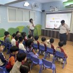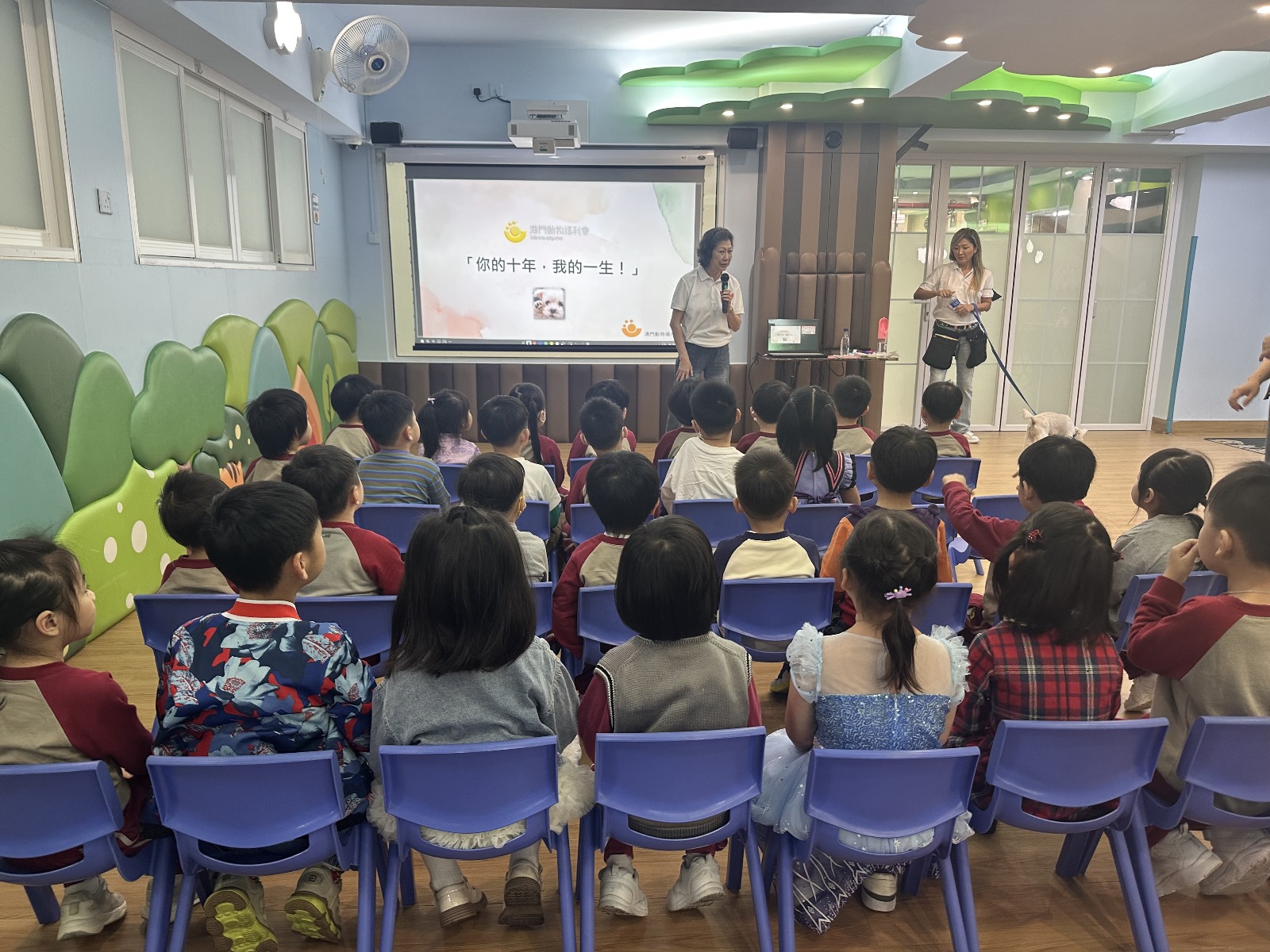 訓練員以主題「你的十年,我的一生!」進行講解,讓幼兒了解狗隻的生命是非常短暫,需要有愛心、耐心、恆心來照顧牠們。當中介紹了照顧狗隻需要注意的事項,如:起居飲食、日常護理等;並教導小朋友如何以正確的方式親近狗隻及避免騷擾流浪狗,強調「領養代替購買」、「不棄養」等觀念。活動過程中,小朋友均細心聆聽及積極回應訓練員的問題。