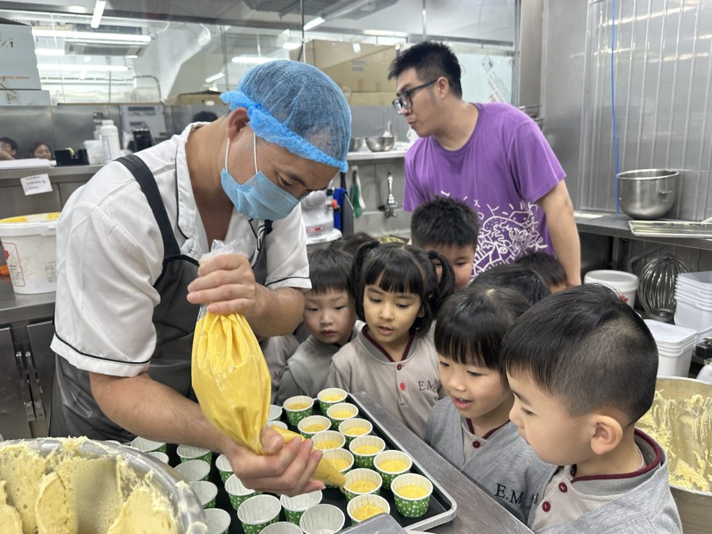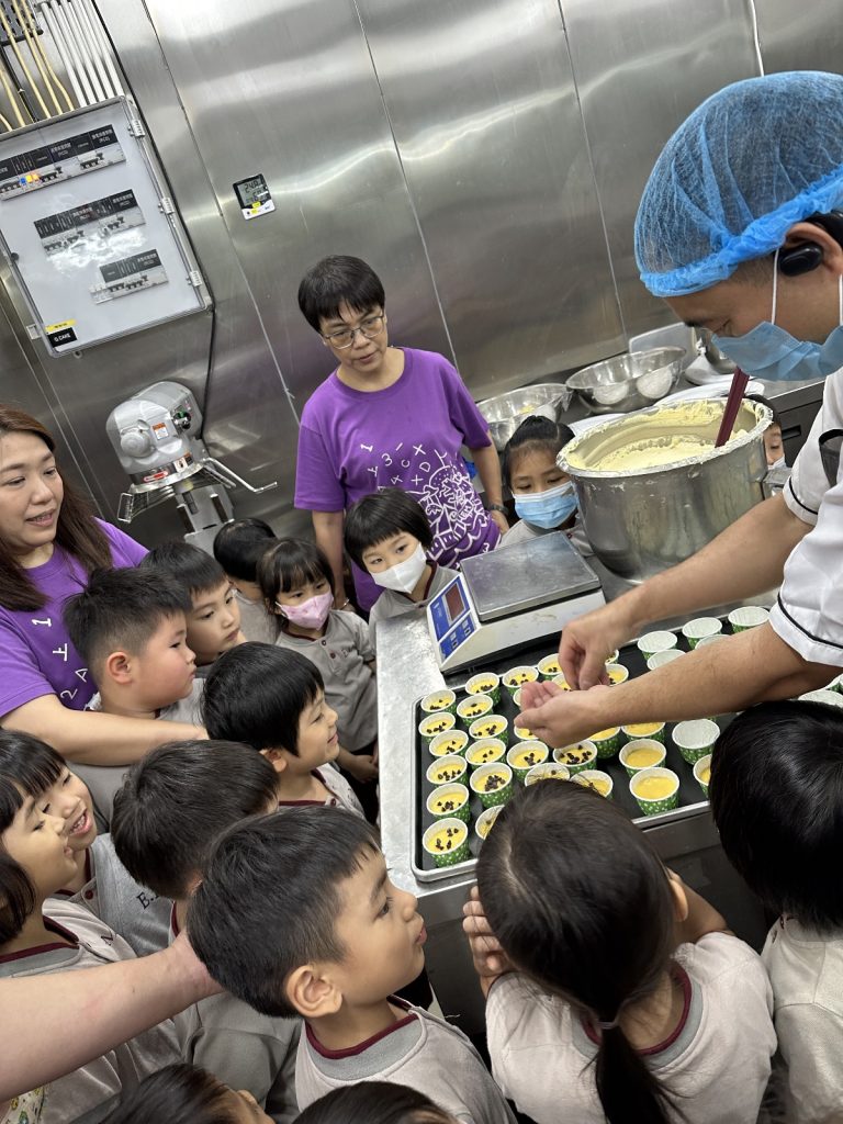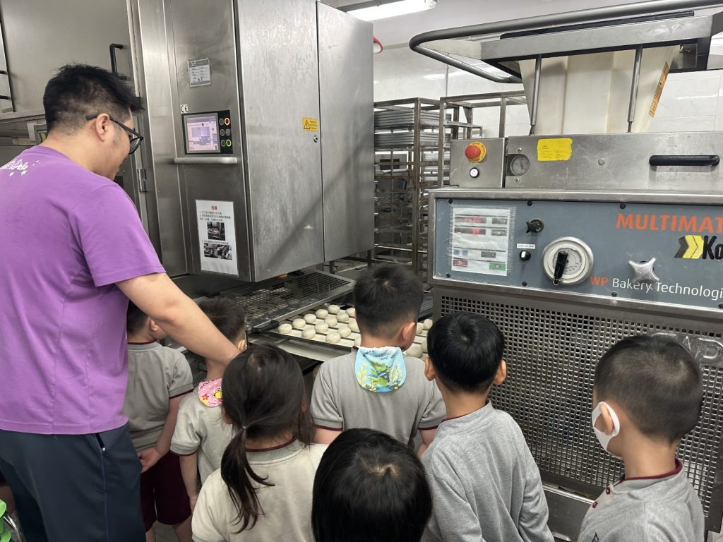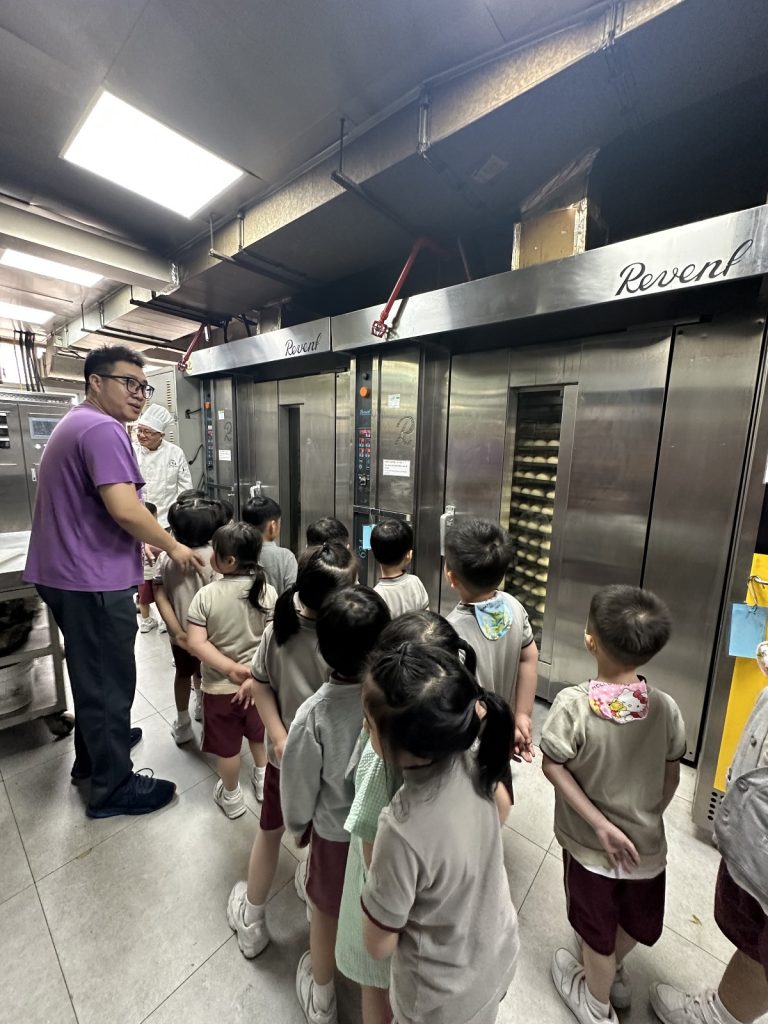 參觀過程中,馬先生向小朋友介紹工廠的歷史和特色產品,再帶領他們參觀了麵粉攪拌機、烘焙爐和包裝機等設備,並詳細解釋每一個機器的功能與用途。小朋友對各種設備充滿好奇及積極發問,展現出對產品製作過程的濃厚興趣。從觀察麵包和糕點由原材料到成品的每一個步驟,感受到食品製作的樂趣。