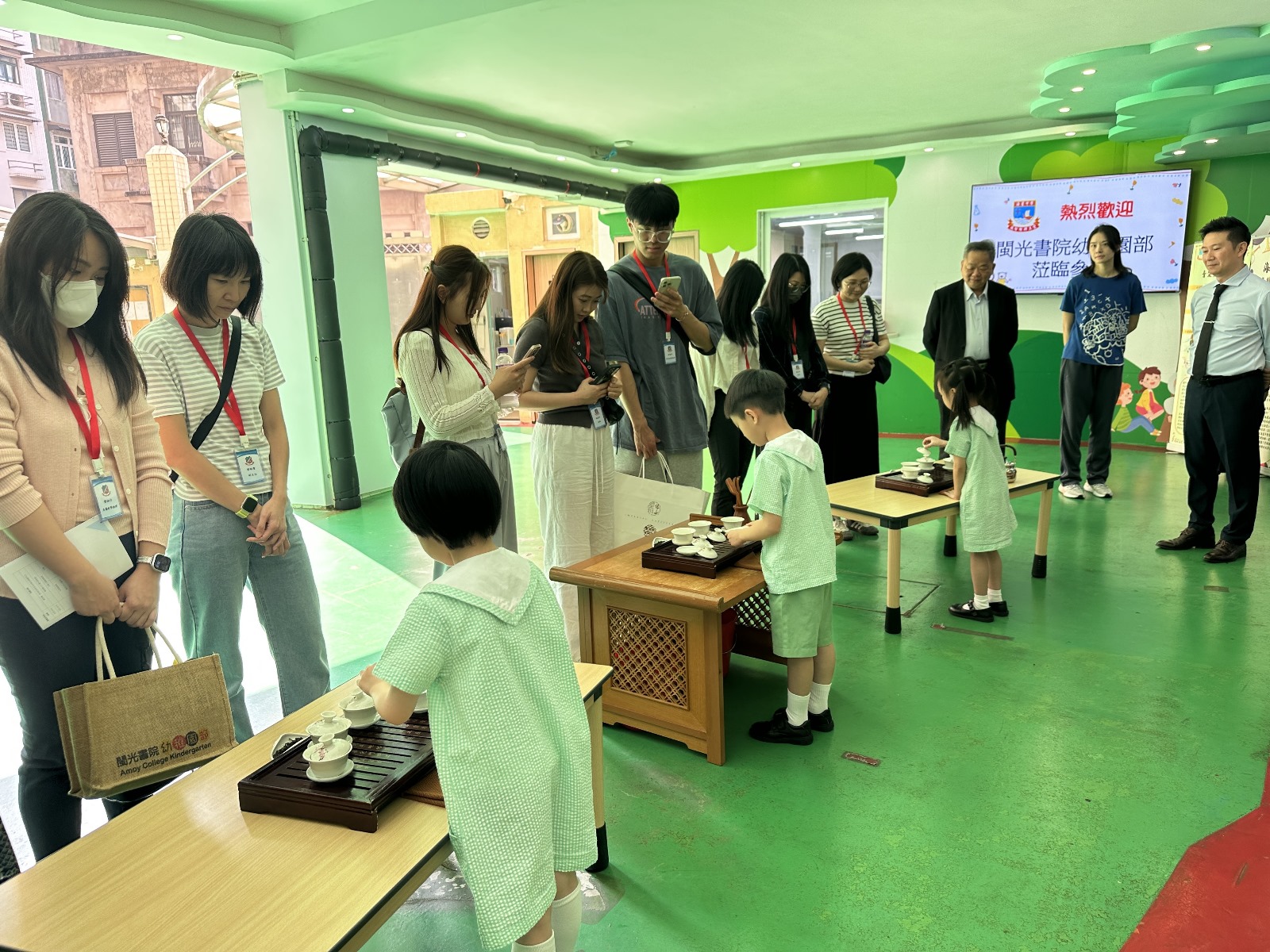 早前,閩光書院幼稚園部校長及老師一行10人到訪本校幼稚園,開展了別具意義的兩校交流。當天活動先由本校幼稚園高班(K3)學生,向到訪的老師進行泡茶歡迎禮,及後,黃彪校長及余思維副校長進行互贈紀念品及全體大合照。