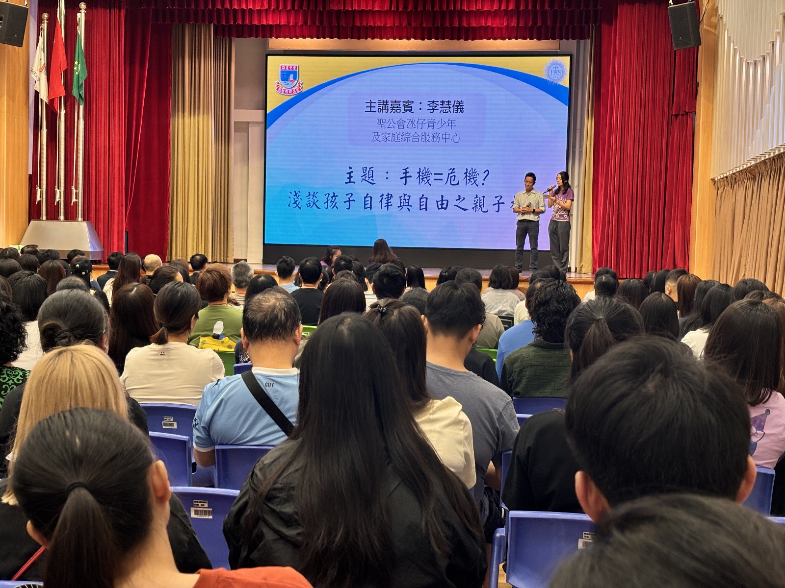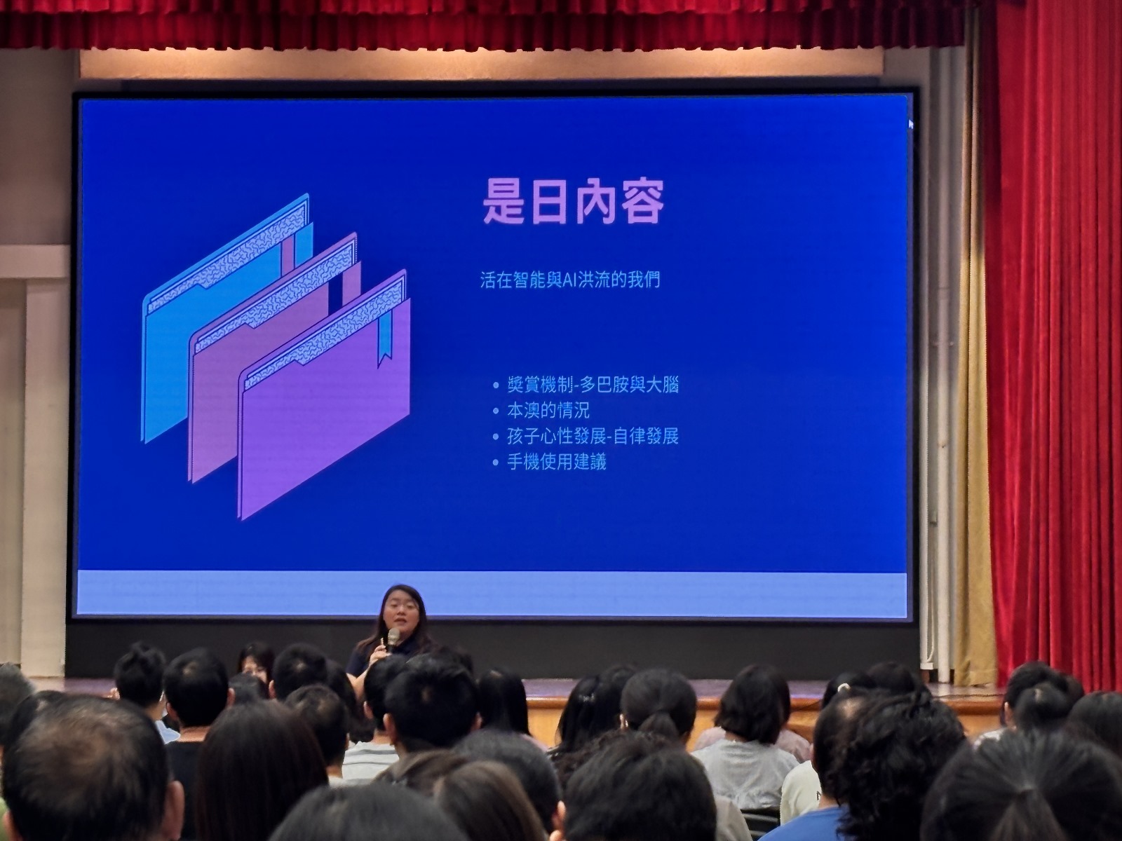 本次家長會特邀聖公會氹仔青少年及家庭綜合服務中心李慧儀主任,以「親子溝通:手機=危機?淺談孩子自律與自由之親子相處」為題進行專題分享。李主任透過生動的AI影片展示,引導家長思考在數位時代如何建立合理的規範,平衡子女使用科技產品的自由與自律。現場互動氣氛熱烈,家長普遍反映講座內容極具啟發性,為親子教養提供了明確方向。