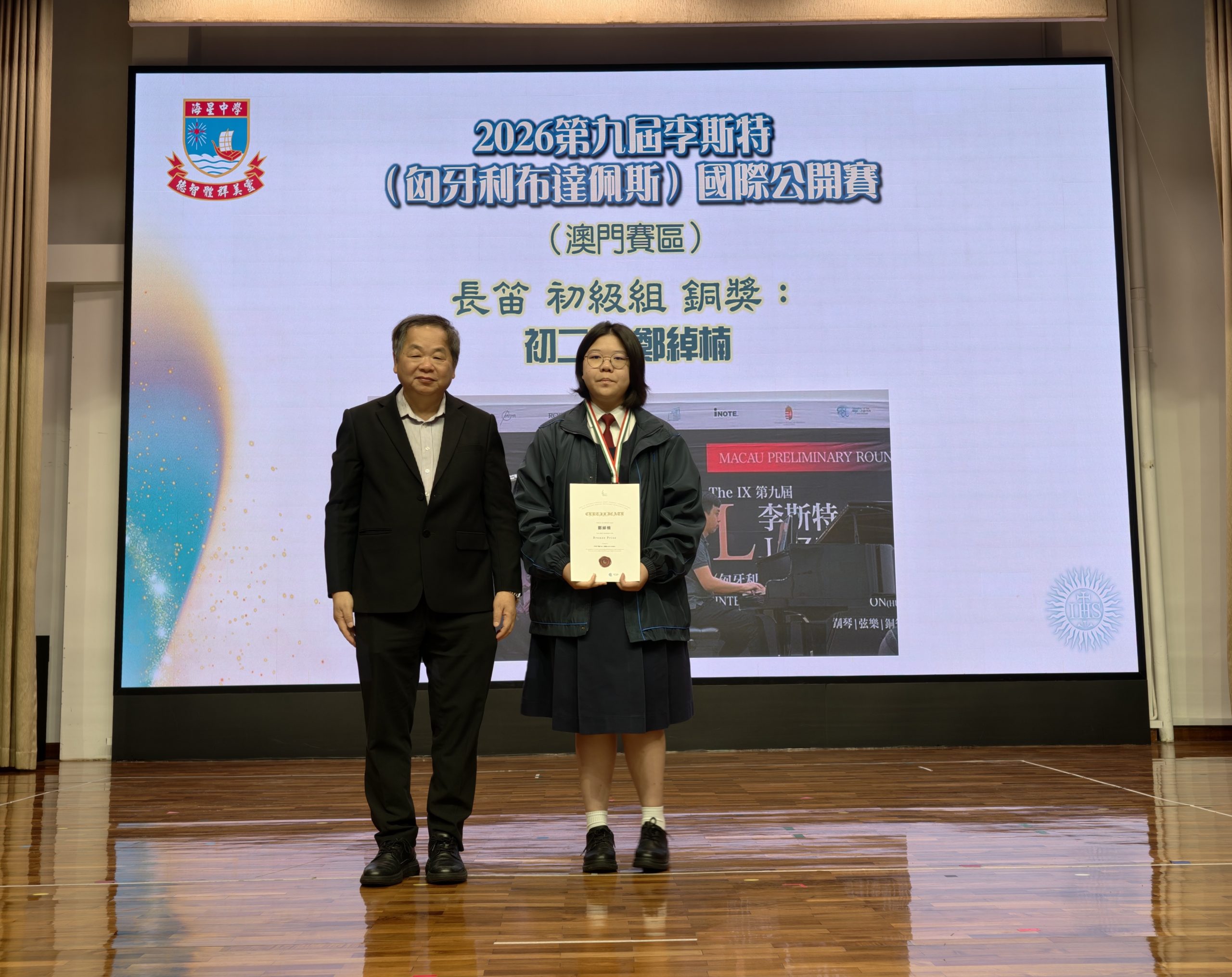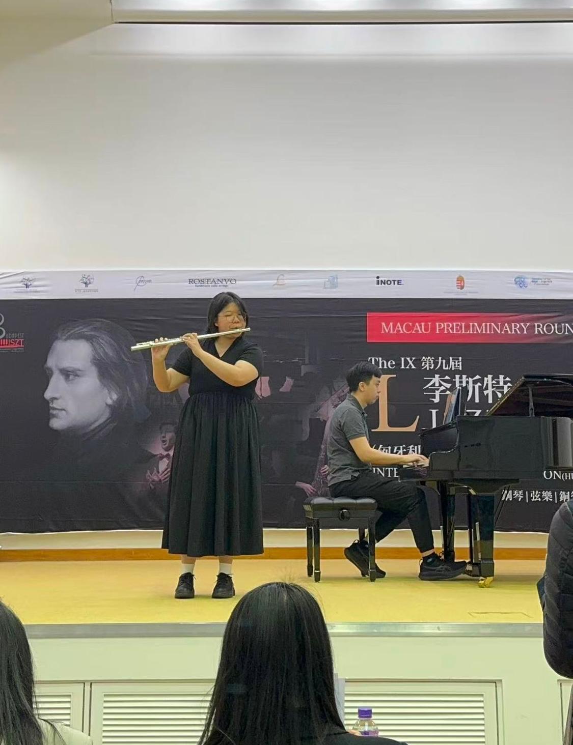 本校學生鄭綽楠在「2026第九屆李斯特(匈牙利布達佩斯)國際公開賽—澳門賽區」中表現出色,於長笛初級組賽事中脫穎而出,榮獲銅獎,為校爭光。